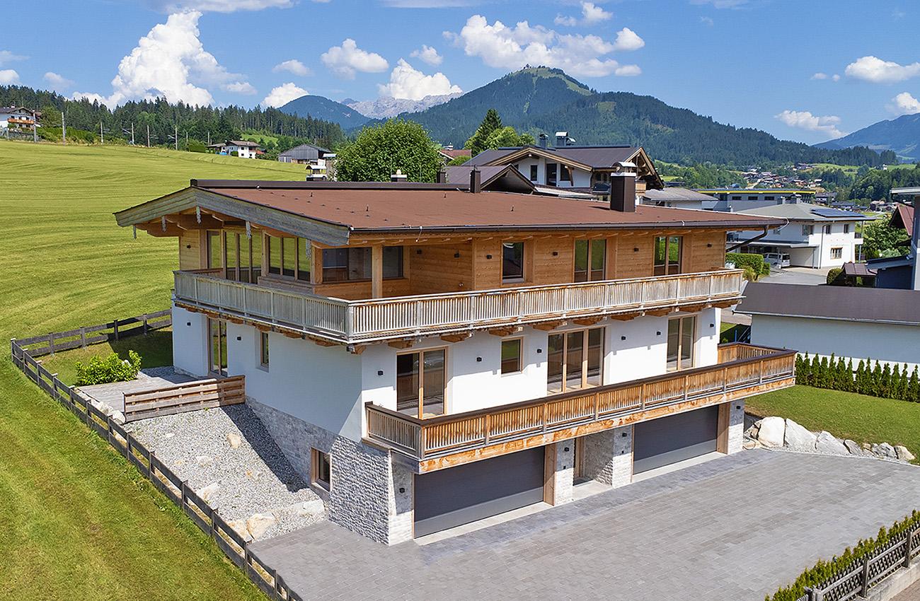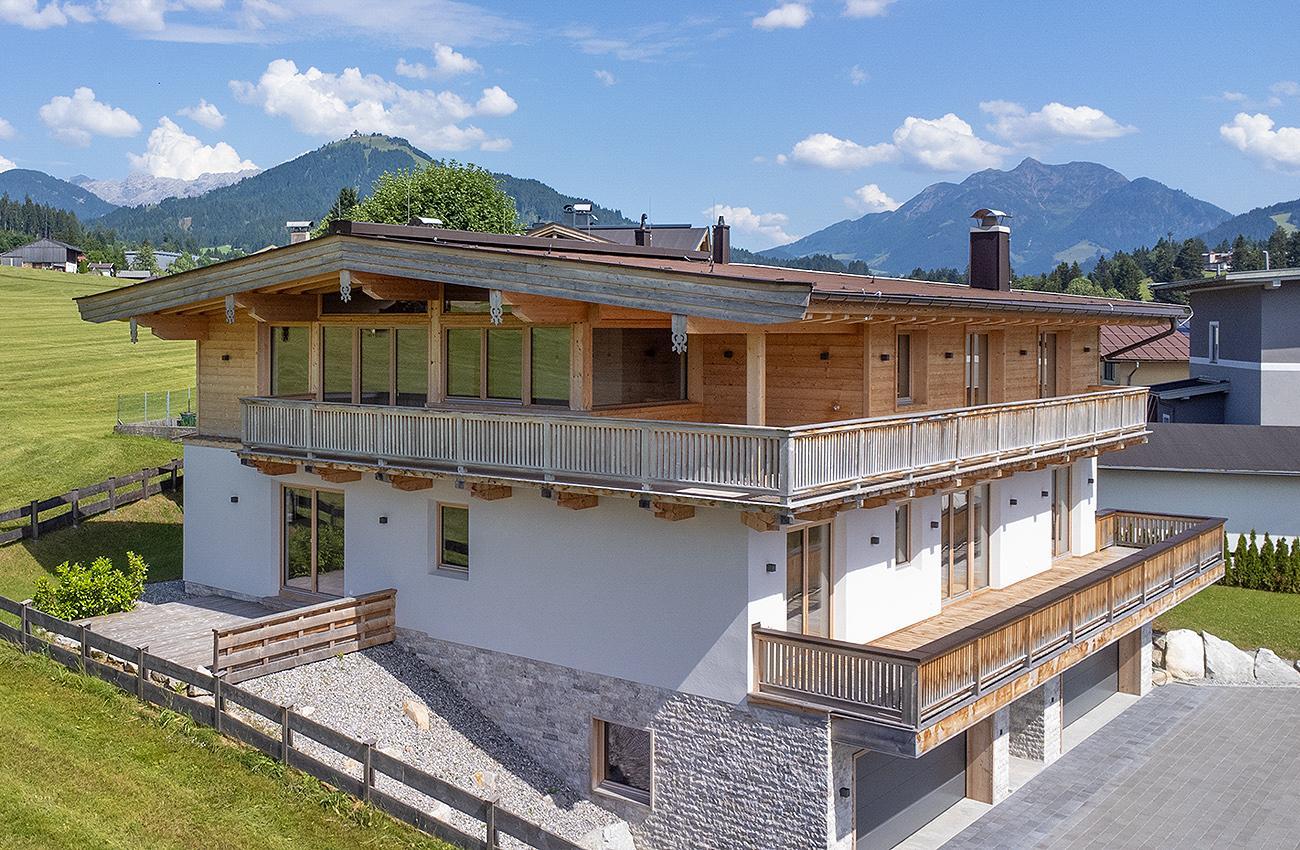 Zum Verkauf steht ein neu gebautes Mountain Chalet mit hochwertiger Ausstattung in Fieberbrunn. Zu den Highlights gehören zwei Doppelgaragen, ein Etagenlift, Wellnessbereich, Echtholzböden aus sibirischer Lärche und teilweise Einbauten aus Altholz.